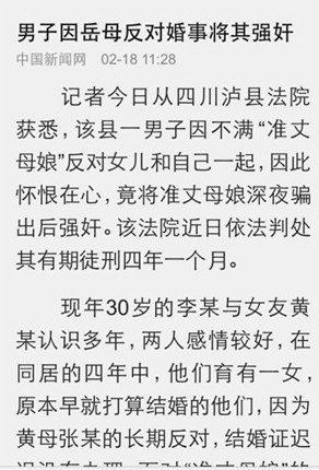 轉發(3) | 評論(5) 15小時前 - 新浪微博 優揚服飾貿易有限公司 男子因岳母反對婚事將其強奸 深夜誘騙強暴準岳母被判4年 http://t.cn/8FThJCt